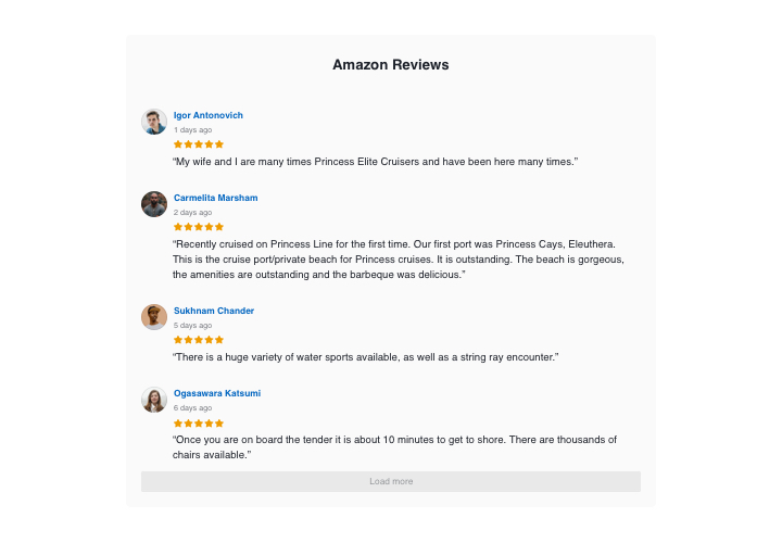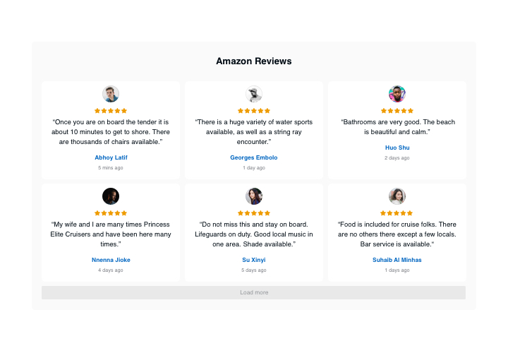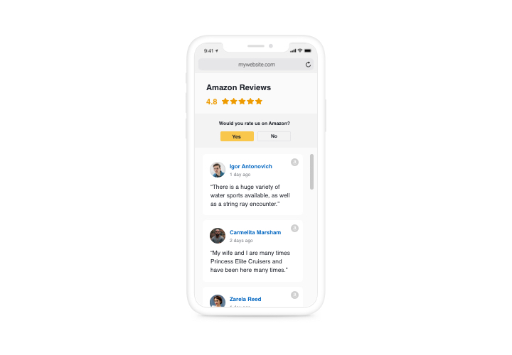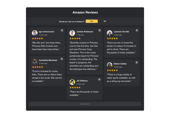 Elfsight Reviews from Amazon widget is the handiest method to shape your brand reputation by showing real clients’ reviews on your commodities. Show only the best or the most meaningful reactions and arrange them the way you like. Garner social proof by demonstrating your clients that you can be trusted.
