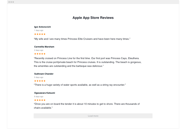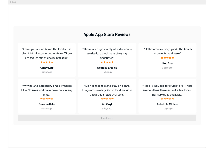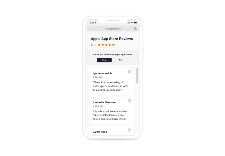 Elfsight Apple Store Reviews is a useful widget giving you a possibility to display the reviews about your products straight on your site. By means of Elfsight widget, you will be able to apply filters for concealing the negative reviews, demonstrate your star rating and number rating, show detailed info about the reviews’ authors, and add a call-to-action button which is there tol drive users to leave their comment. Elfsight Apple Reviews widget will help you demonstrate your high social proof on the website and draw new sales.