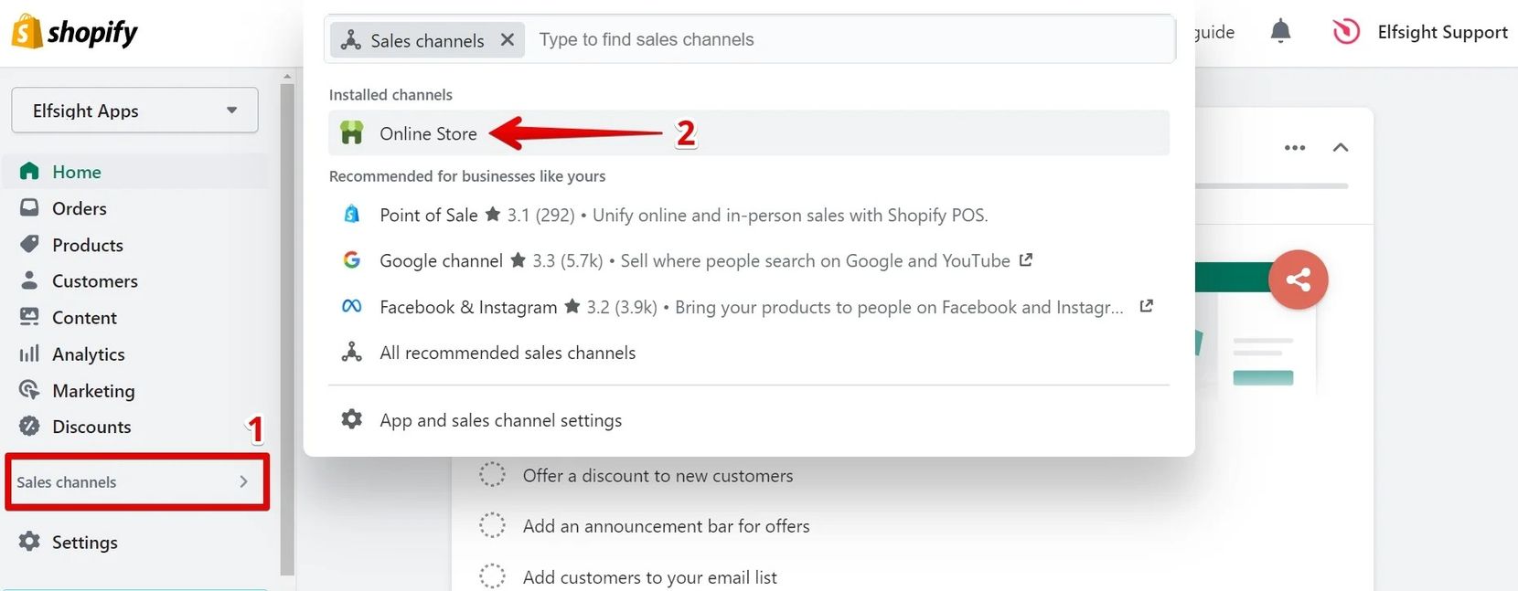 - Access your website’s visual editor. Begin by logging into your Shopify admin panel. Navigate to Sales Channels → Online Store.
