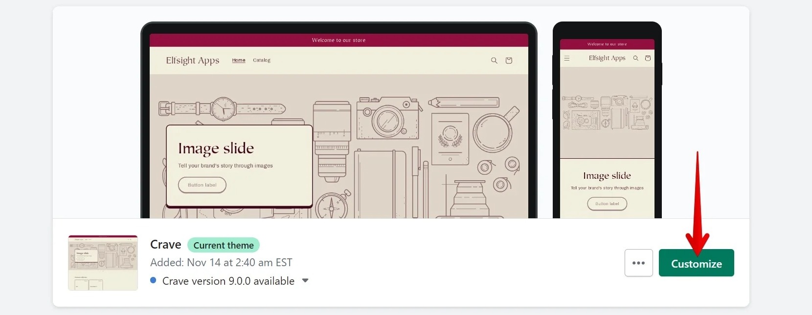 - Access your website’s visual editor. Start by logging into your Shopify admin panel. Navigate to Online Store → Themes, and then click on the Customize button.
