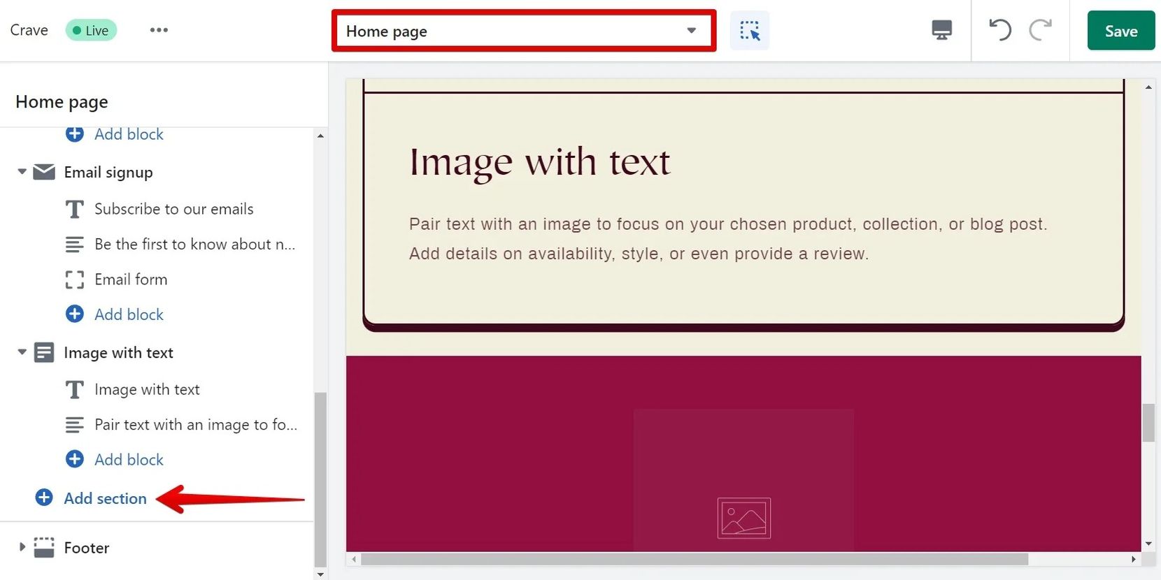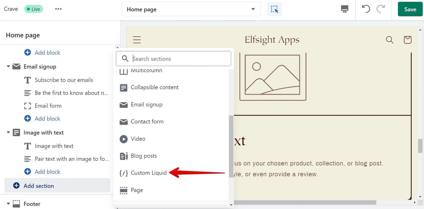 - Insert a Custom Liquid section on the desired page. When you open the visual editor, it defaults to the home page. If you want to customize a different page, simply select it from the dropdown menu at the top. To add the widget, click Add Section: