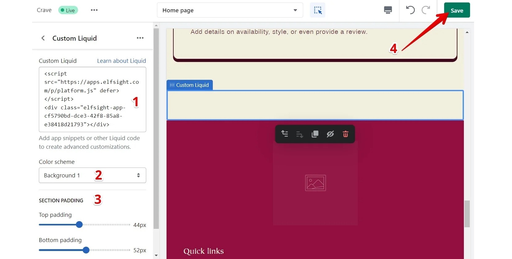 - Input the installation code. In the Custom Liquid field, paste the widget installation code. You can also adjust the Color scheme and set the Top/Bottom paddings to your preference. Once you’re satisfied, save your changes.