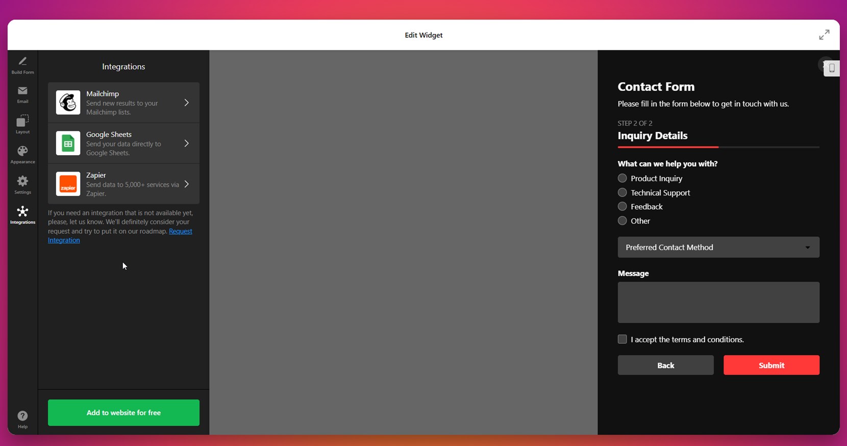 - Connect Third-Party Integrations. Link your form with services like Mailchimp, Google Sheets, or Zapier through the Integrations tab. This allows you to automatically collect and manage submissions with your preferred tools.