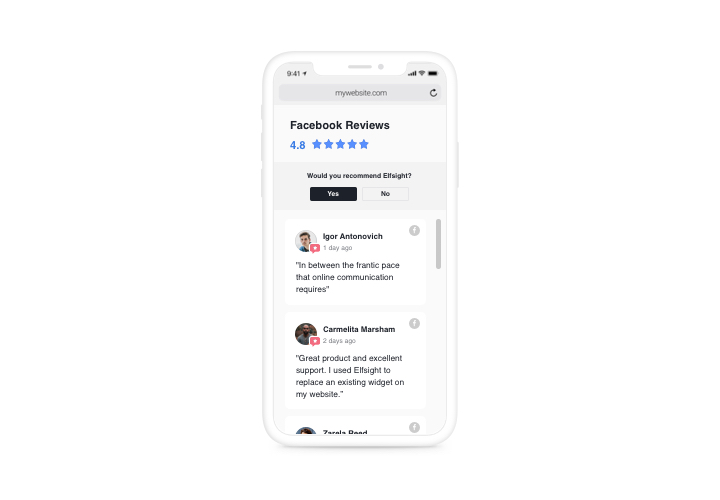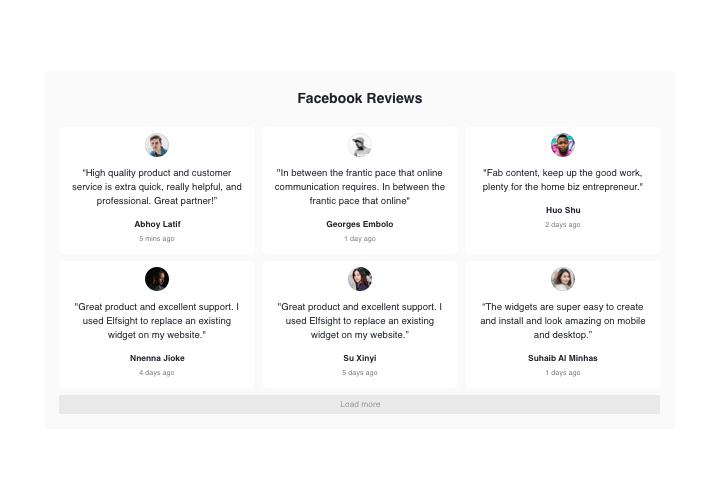 Präsentieren Sie mithilfe von Elfsight Ihre Kundenbewertungen von Facebook auf der Website Facebook-Bewertungen und zeigen Sie Ihre Vertrauenswürdigkeit. Das Website-Publikum kann in einem Widget mit klarem Design und Original-Facebook-Details sehen, was Benutzer auf Facebook über Sie sagen. Die Benutzeroberfläche ist anpassbar und verfügt über Sternebewertung, Autoreninformationen, umschaltbare Komponenten sowie vordefinierte Layout- und Vorlagenvarianten. Über Elfsight Facebook Reviews können Sie eine Schaltfläche anzeigen, um eine neue Bewertung zu schreiben und neues Feedback zu erhalten.