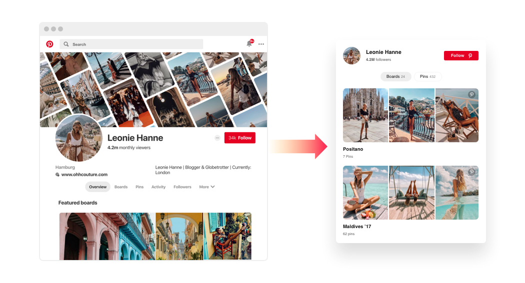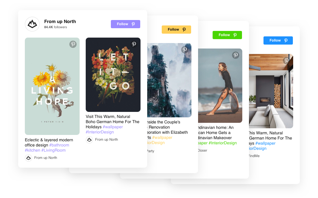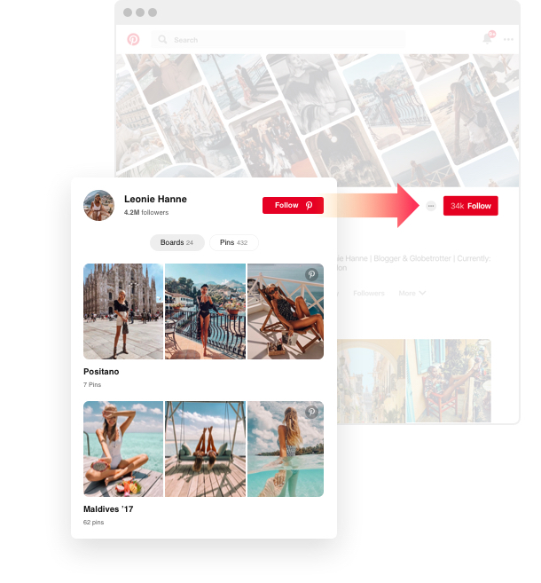 Der einfachste Weg, ein neues Publikum für Ihre Pinterest-Inhalte zu gewinnen, besteht darin, sie auf Ihre Website zu bringen. Integrieren Sie mit dem Elfsight-Widget Ihr Pinterest-Konto in die Website, indem Sie einfach Ihren Benutzernamen in das Quellfeld eingeben. Das Widget kann Ihre Boards, Pins oder beides anzeigen. In der Kopfzeile befinden sich anklickbarer Kontoname und Bild, um Benutzer zu Ihrem Pinterest-Konto zu leiten. Machen Sie das Beste aus Ihrem Pinterest-Feed auf der Website – lassen Sie ihn an Popularität gewinnen und bringen Sie mehr Follower. Elfsight Pinterest Feed verfügt über eine Schaltfläche „Folgen“ in der Kopfzeile des Widgets. Auf diese Weise können Ihre Besucher mit einem Klick Anhänger Ihres Kontos werden. Erweitern Sie mühelos Ihre soziale Reichweite!Demonstrieren Sie Ihr Pinterest-Profil auf Ihrer Website