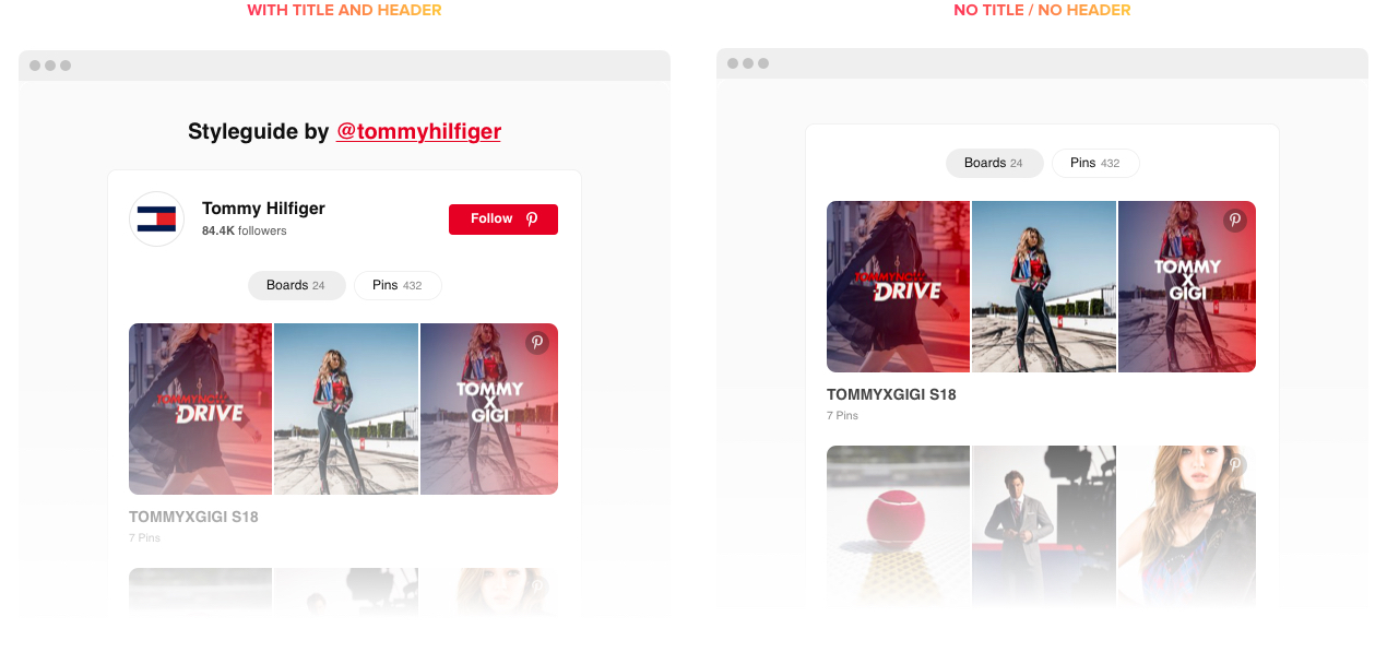 Elfsight Pinterest Feed lässt sich leicht für jeden Anwendungsfall konfigurieren, und der Header spielt hier eine große Rolle. Wenn diese Option aktiviert ist, werden der Name und das Bild Ihres Kontos mit der Schaltfläche „Folgen“ sowie die Anzahl der Follower angezeigt, was zur Authentizität beiträgt. Wenn Sie den Header ausschalten, wird Ihr Widget zu einer sauberen und minimalistischen Galerie. Vergessen Sie nicht, auch den Widget-Titel anzuzeigen. Er kann bearbeitet werden, sodass Sie Ihren eigenen Text hinzufügen können.