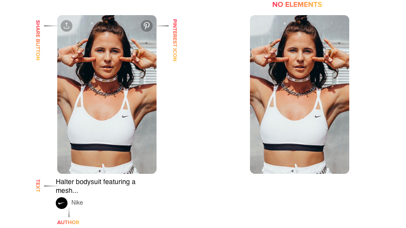 Die Pins in Ihrem Feed können mit zusätzlichen Elementen wie Text und Autor oder auf minimalistische Weise angezeigt werden, beispielsweise wenn Sie eine saubere, übersichtliche Galerie erstellen möchten. Es gibt vier umschaltbare Elemente: Autor, Text, Schaltfläche „Teilen“ und Pinterest-Symbol. Jeder von ihnen kann mit nur einem Klick ein- und ausgeschaltet werden.