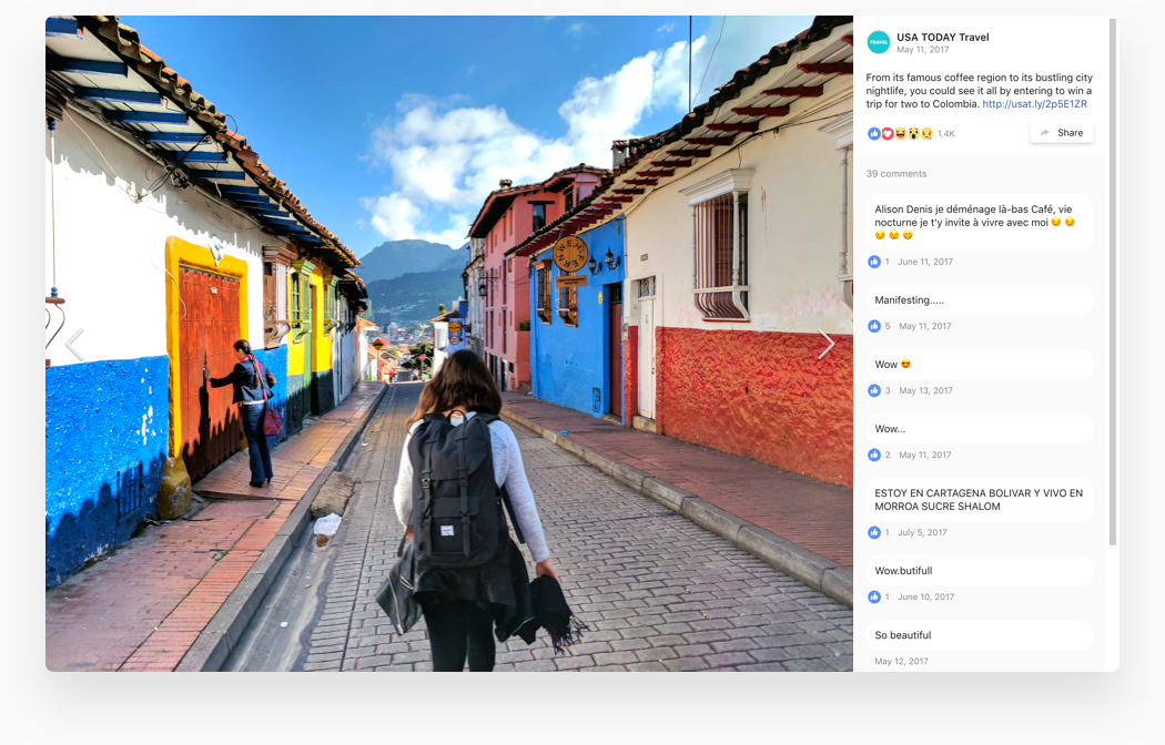 Make your content look impressive in full screen with awesome popup. On a click, your visitors will see your photos and videos in full size with description, comments with emojis, like and share counts, as well as a Share button.