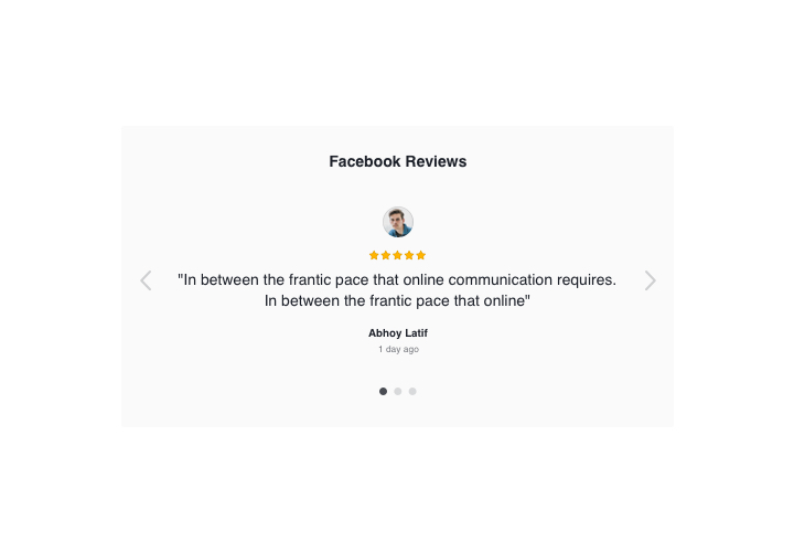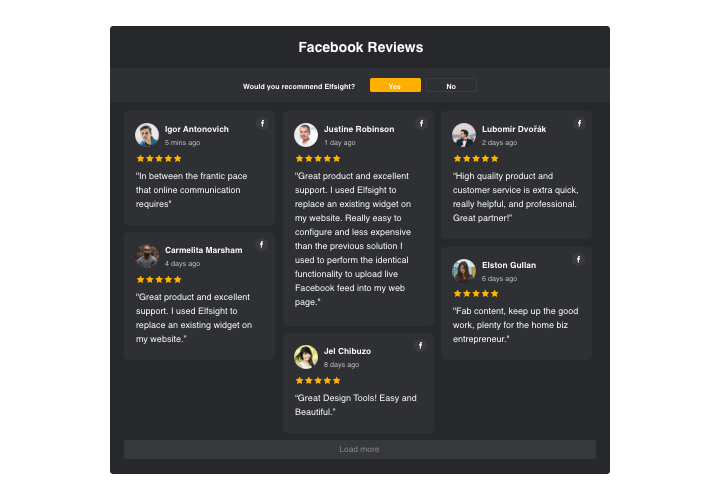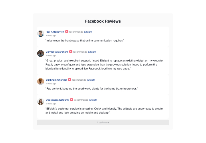 Display your client reviews from Facebook on the site using Elfsight Facebook Reviews and prove your trustworthiness. You website audience will be able to see what users say about your products on Facebook in a widget with balanced design and authentic Facebook elements. The interface is flexible and features star rating, author information, switchable elements, and ready layout and template variants. Using Elfsight Facebook Reviews, you can show a button to write one more review and have new feedback.