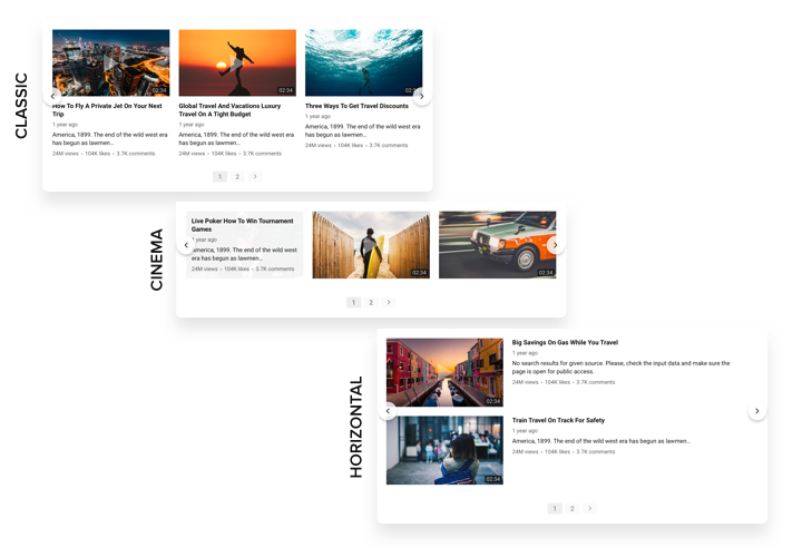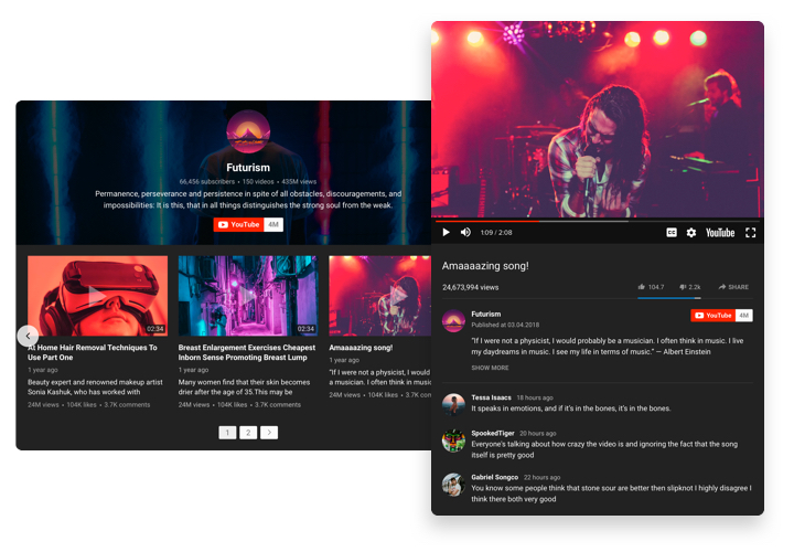 Un widget polyvalent pour YouTube, qui donne la possibilité d’afficher différentes vidéos sur l’onglet de votre page. Choisissez les chaînes et les clips vidéo individuels requis pour concevoir votre liste de lecture personnelle et intégrez-la directement sur la page en utilisant la mise en page la plus appropriée (galerie vidéo, portfolio, chaîne, vidéo unique). Notre widget est parfaitement compatible avec tous les appareils et plateformes, il dispose de plus de 100 options, d’une mise en page personnalisable et de nombreux autres avantages, qui vous donnent la possibilité de l’intégrer sur différentes pages.