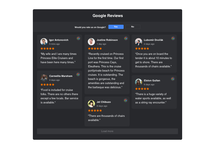 Le recensioni condivise da persone reali sono estremamente credibili per i visitatori del tuo sito web, dimostrando che la tua azienda è un partner affidabile. Una valutazione elevata e recensioni eccellenti possono aiutarti a incrementare gli acquisti dal tuo sito. Inoltre, il pulsante attivo contribuirà a ricevere più recensioni dei clienti relative alla tua attività su Google.