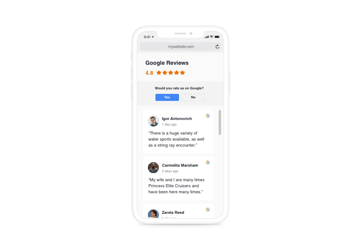 Recenzje dodane przez prawdziwych ludzi wydają się osobom odwiedzającym Twoją witrynę maksymalnie godne zaufania i pokazują im, że można zaufać Twojej firmie. Wysoka ocena i doskonałe recenzje mogą pomóc w podniesieniu poziomu zakupów na Twojej stronie. Co więcej, aktywny przycisk w widgecie jQuery może przyczynić się do zwiększenia liczby opinii klientów na temat Twoich ofert lub usług w miejscach Google.